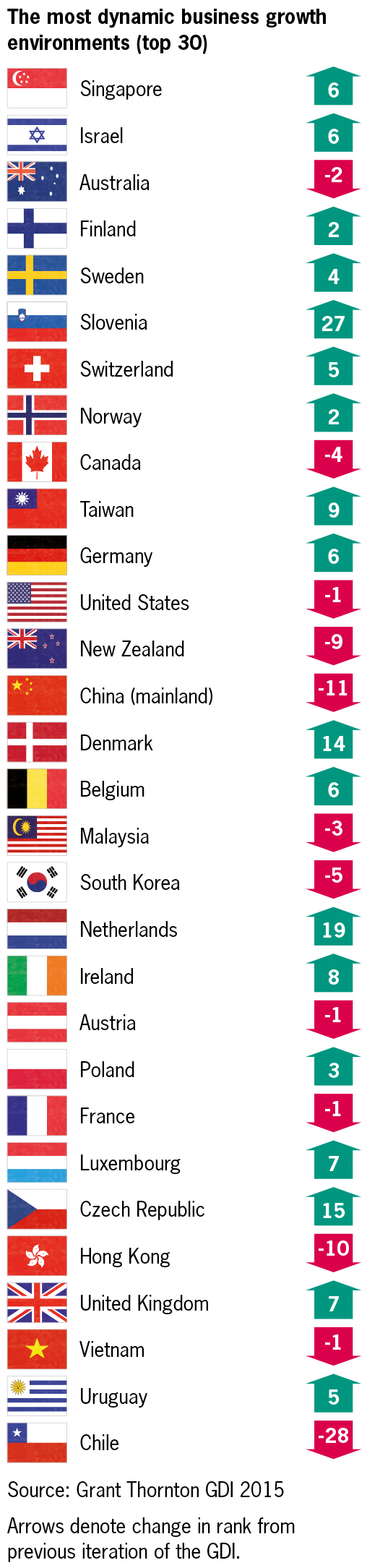 Globally, Singapore (rank 1) leads the GDI 2015. It ranks top for financing environment and no lower than 25 in any other growth area, highlighting the country’s robust, broad-based offer to dynamic businesses. Israel (rank 2) has also risen six places this year. It comes top for technology due to strong research and development spending. Australia (rank 3=) drops two places but still ranks in the top five for business operating environment and labour market. Finland (rank 3=) and Sweden (rank 5) have both risen slightly, due to their favourable business operating environments and an advanced technology infrastructure.