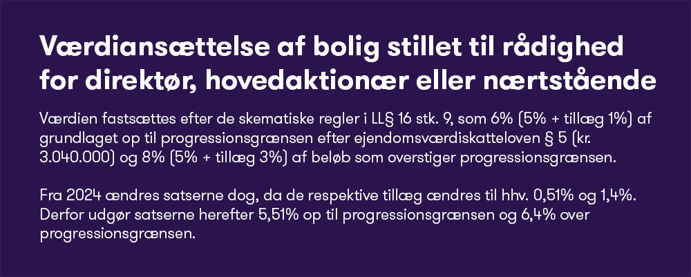 Hvis en direktør eller hovedaktionær får stillet en bolig til rådighed af deres arbejdsgiver/selskab til en billigere leje end beregnet efter de skematiske værdier jf. LL§16 stk. 9, sker der differencebeskatning hos hovedaktionæren som personlig indkomst enten som løn eller udbytte. Det gælder også ved udlejning til hovedaktionærens nærtstående.