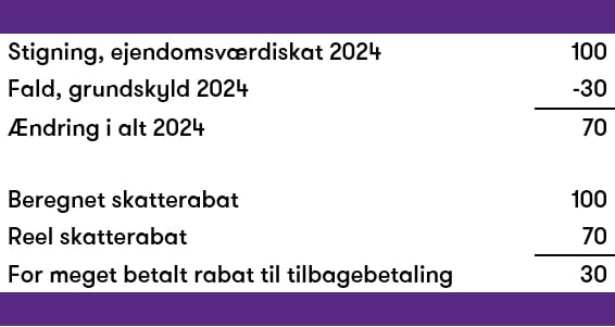 Står en boligejer i en situation med både en stigning og et fald i skatterne, vil der derfor blive opgjort en for høj skatterabat på forskudsopgørelserne for 2024 og 2025. Det kan illustreres i nedenstående eksempel, hvor man har fået en for stor skatterabat. Her skal man så tilbagebetale den ”uberettigede” del af rabatten. Reguleringen af skatterabatten og tilbagebetalingen sker i forbindelse med boligejerens årsopgørelser for 2024 og 2025.