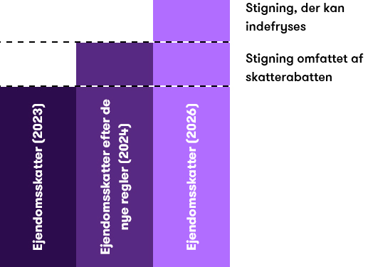 Det er vigtigt at påpege, at skatterabatten kun omfatter stigningen ved overgangen til nye regler, altså stigninger i de beregnede ejendomsskatter for henholdsvis 2023 og 2024. Stiger skatten efterfølgende i f.eks. år 2026, vil skatterabatten stadig gælde, men boligejeren beskattes af den del af stigningen i ejendomsskatter, der overstiger skatterabatten.