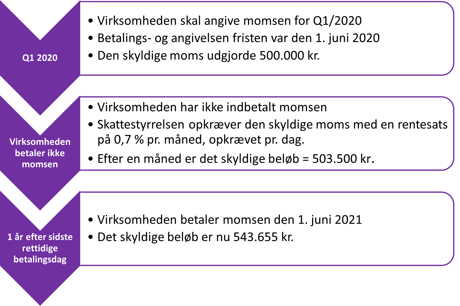 Renterne kommer i praksis til at fungere sådan, at de påløber sidste rettidige betalingsdato. Den sidste rettidige betalingsdato afhænger af virksomhedens momsperiode; halvårs-, kvartals- eller månedsmoms.