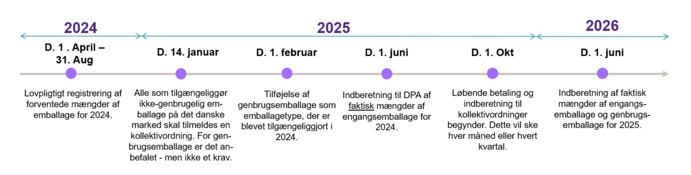 Hvis I skal indberette emballage efter den 1. juni 2025, skal I først registrere jer hos DPA (Dansk Producentansvar). Her bliver I bedt om at indberette forventede mængder for hele 2025. Dette skal ske senest 14 dage, inden emballagen bliver tilgængelig på markedet. Det er et lovkrav for at kunne sælge et produkt på det danske marked.