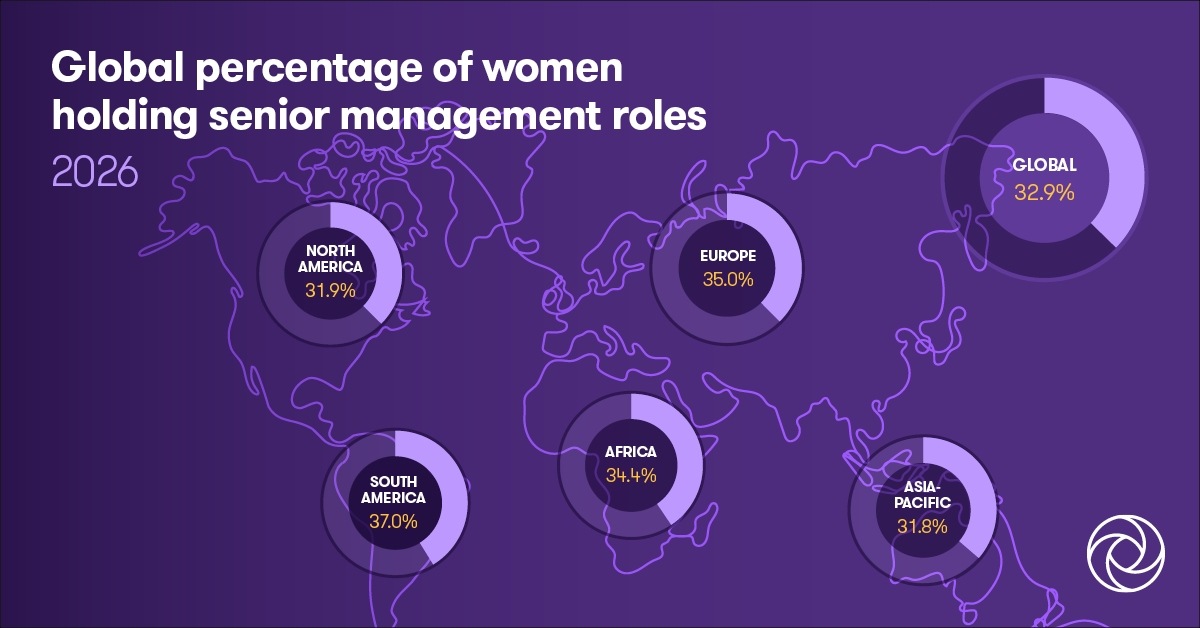 Mens flertallet af de globale regioner har oplevet tilbagegang, holder Europa niveauet med en andel af kvindelige seniorledere på 35 %, 0,1 % højere end i 2025.
